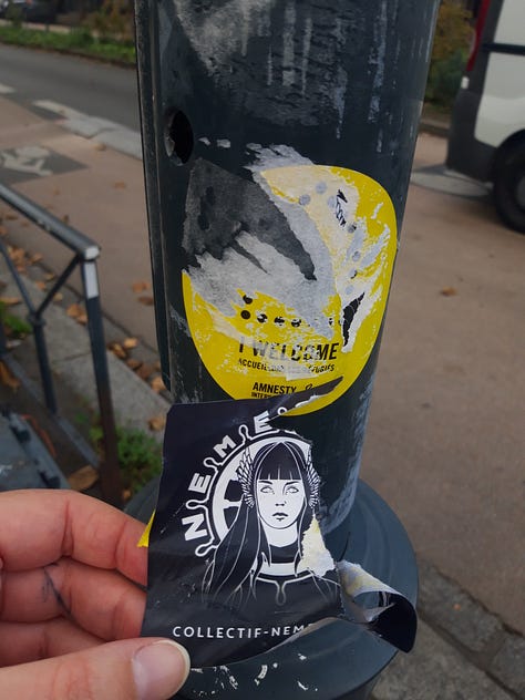 Depuis quelques jours, j’arrache donc des stickers de Némésis. Je pense que la bulle informationnelle joue, mais je suis alarmée de voir que si je ne le fais pas, ça reste. Pour moi, ce n’est pas une information secrète, le véritable dessein de ce groupe. Il y a deux stickers que je n’arrivais pas à enlever, je n’avais rien pour les couvrir, j’ai dû les laisser et revenir. Deux jours après, je reviens enfin avec mes petites affaires, et ils étaient toujours là. Pourtant, je suis dans une ville étudiante, de gauche, avec un bastion militant. Les stickers n’étaient pas en rase campagne mais en plein centre-ville, à proximité du centre commercial, de la bibliothèque. En évidence. Par ailleurs, Némésis est connu pour ses coups de communication. Alors j’avoue que je suis un peu dépassée par cette paresse, voire cette complaisance. Bah oui quoi, ce sont que des stickers.